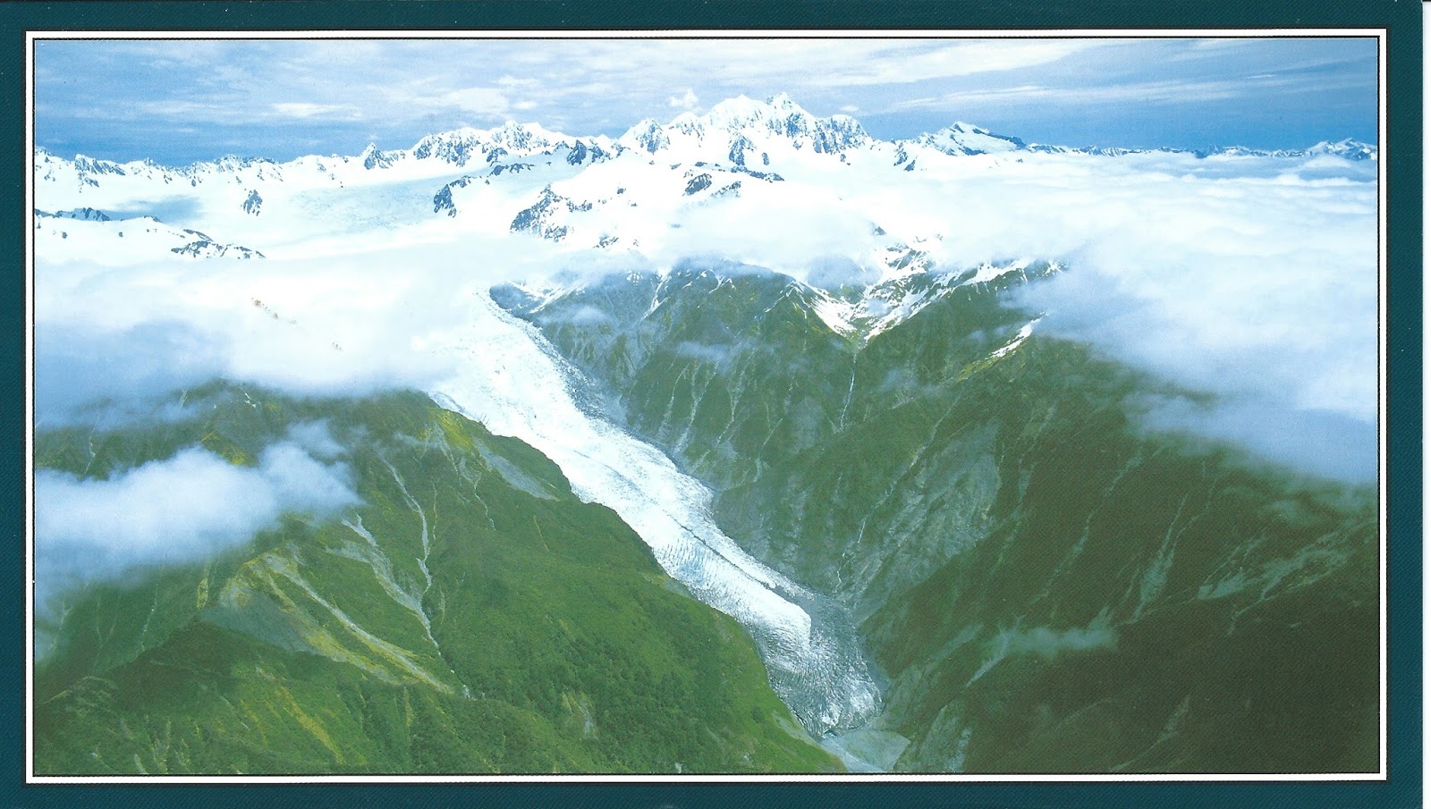 A view looking south-east over the popular Franz Josef Glacier, named after an Australian King. In the distance, Mt Tasman an Mt Cook rise above the Southern Alps. A huge number of people walk to the base of the glacier, and even take guided trips up on it, but flying around the area is also a spectacular option.