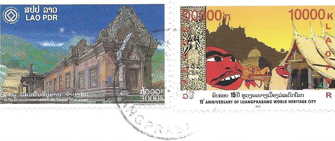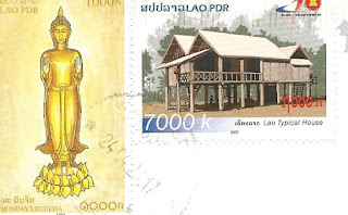 ... Great Laos postcard nr2....view of Laos' past....the old name of Laos is Lan Xang "the land of a million elephants and the white parasol" (the dynasty coat of arms is shown on the front porch)... all your "accidentally" bought postcards are more than welcome here Jobbo✈...with nice matching Unesco stamps...Thanks a lot!!