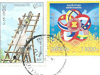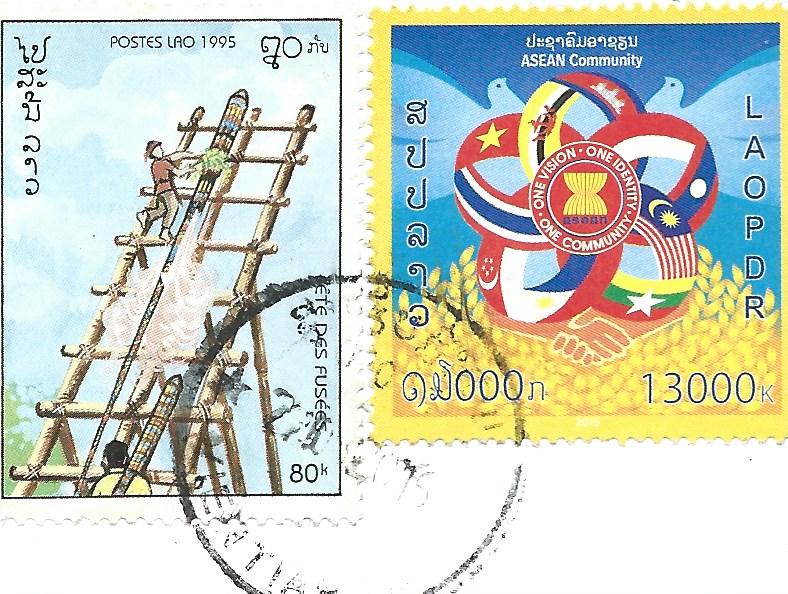 ... And postcard nr2 shows beautiful Laos girls dressed in very luxery traditional clothing... no Lao festival would be complete without its beauty contest, of which Nang Sangkhan (Miss New Year) is the most famous of all... there are seven contestants, each one symbolizing one of King Kabinlaphom's seven daughters... the procession of the beauty queen is spectacular and hugely popular... with great exactly matching girls on stamp... Big Thanks Jobbo!!